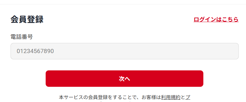 まずは会員登録します。いきなり電話番号が必要になるちょっと珍しいパターンです。